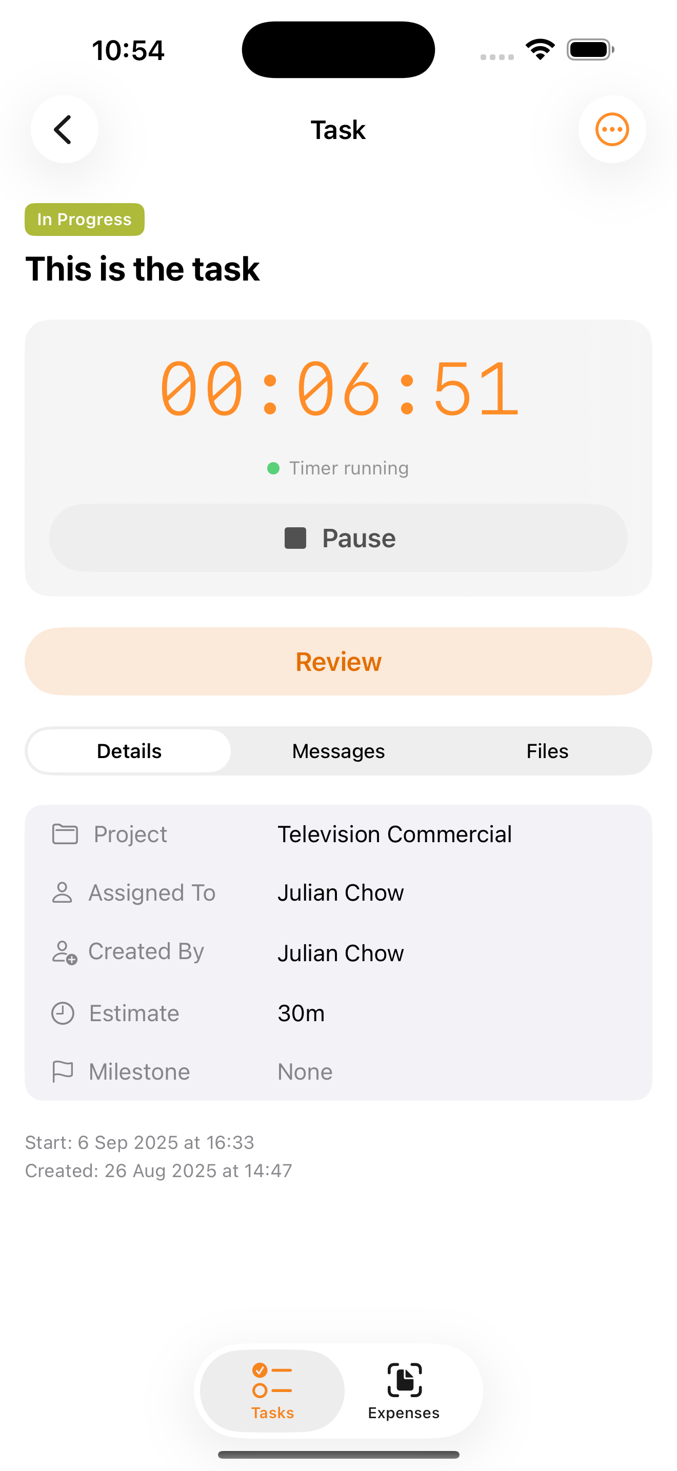 View your assigned tasks, start and stop timers, and create new tasks — all from your phone.